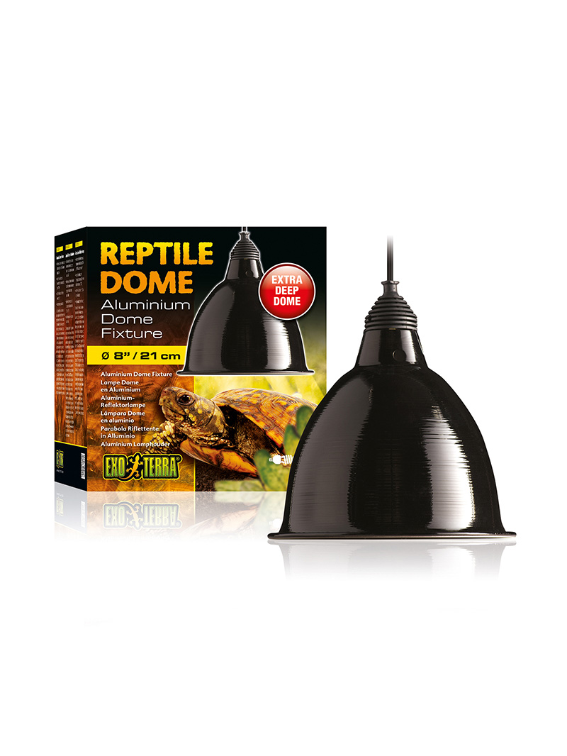 Exo Terra Reptile Dome je svítidlo pro žárovky s mimořádně dlouhou hliníkovou odraznou kopulí, která přesahuje čelní plochu většiny žárovek.