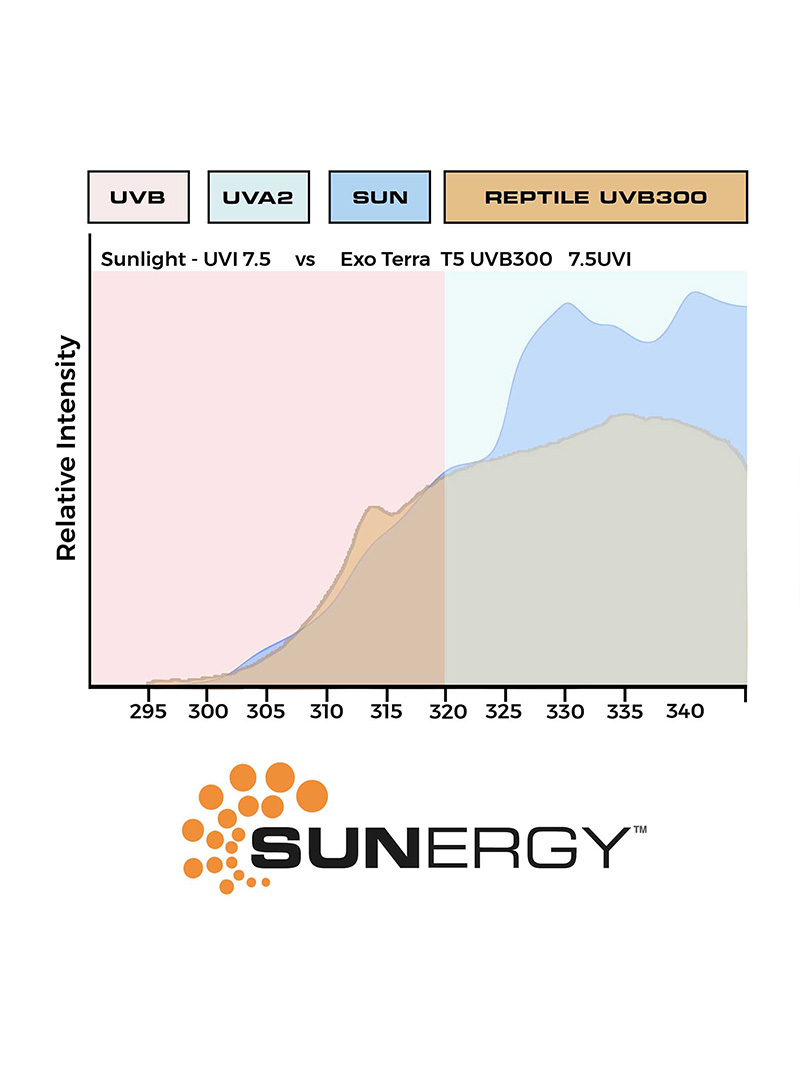 Pokročilá technologie Exo Terra Sunergy napodobuje sluneční energii přesněji než jakákoli jiná lampa na trhu. VHO T5 trubicová zářivka UVB si udržuje vysokou účinnost více než 12 měsíců a díky výborné UVB penetraci je ideální i pro vyšší terária s hustou síťkou.
