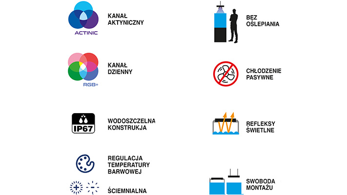 Plán denního osvětlení (východ, západ, den, noc) lze nastavit zvlášť pro aktinický a denní kanál pomocí ovladače AQCT-2 (je součástí dodávky).