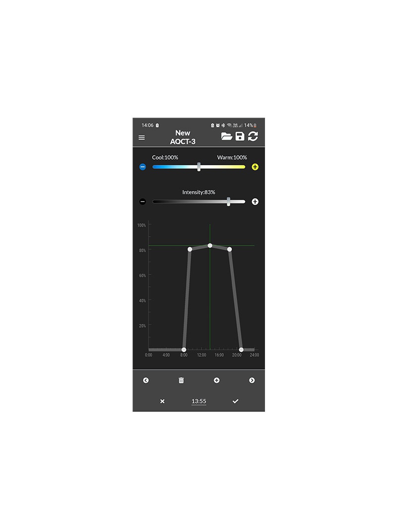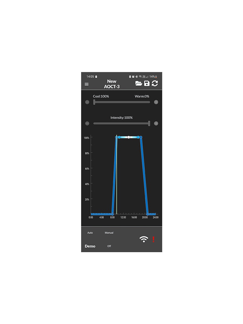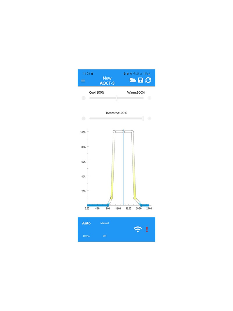 Skylight AQCT-3 -ohjain on suunniteltu Skylight-valaisimien käyttämiseen älypuhelimeen asennetun sovelluksen avulla. Säädä tehoa, värilämpötilaa ja aikatauluta automaattiset auringonnousut tai -laskut.