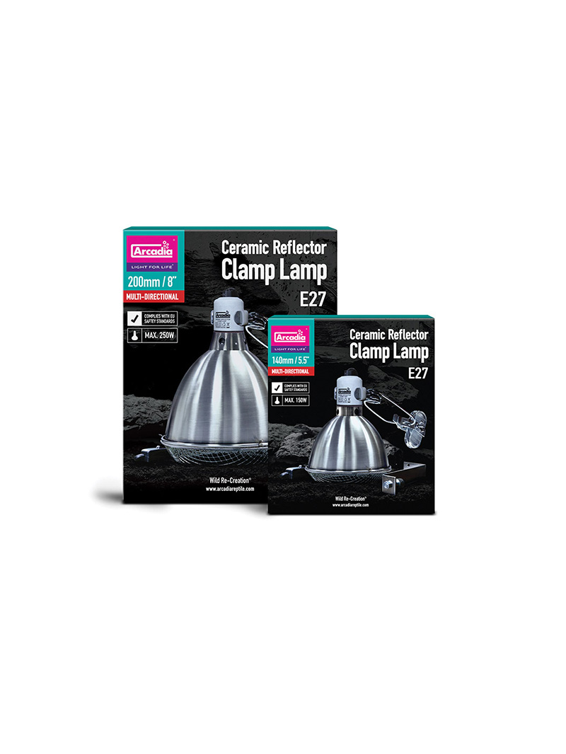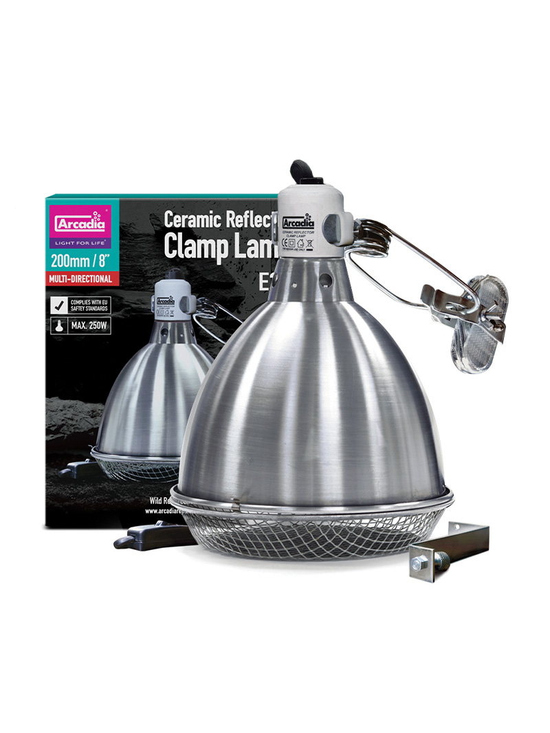 Arcadia Reptile Clamp Lamp è un kit completo che contiene tutto il necessario per montare le lampadine riscaldanti (e altre fonti di luce e calore) in vasche aperte dall’alto. Utilizzando l’adattatore incluso, può essere montata anche all’interno di un terrario di legno.