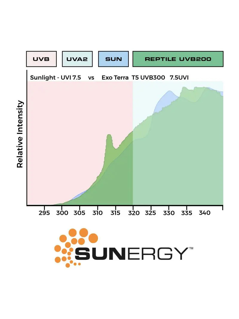La tecnologia avanzata Exo Terra Sunergy replica la potenza del sole meglio di qualsiasi altra lampada sul mercato. Il neon VHO T5 mantiene un’elevata efficacia per oltre 12 mesi, e la sua eccellente penetrazione UVB lo rende perfetto anche per terrari alti con griglie fitte.