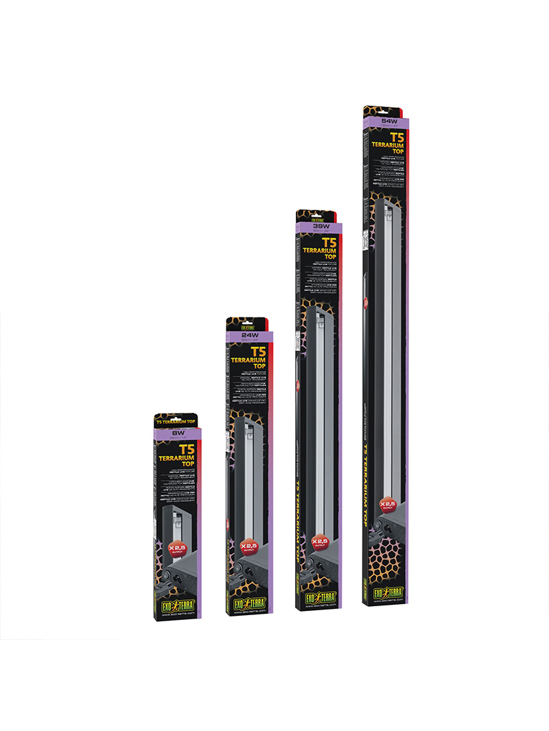 Exo Terra T5 Terrarium Top High-Performance Reptile UVB Fixture to nowoczesna oprawa oświetleniowa do świetlówek T5. Została zaprojektowana z myślą o użytku z Exo Terra Reptile UVB VHO T5 Bulb, ale może być również używana z każdą inną świetlówką liniową T5 o odpowiedniej mocy.