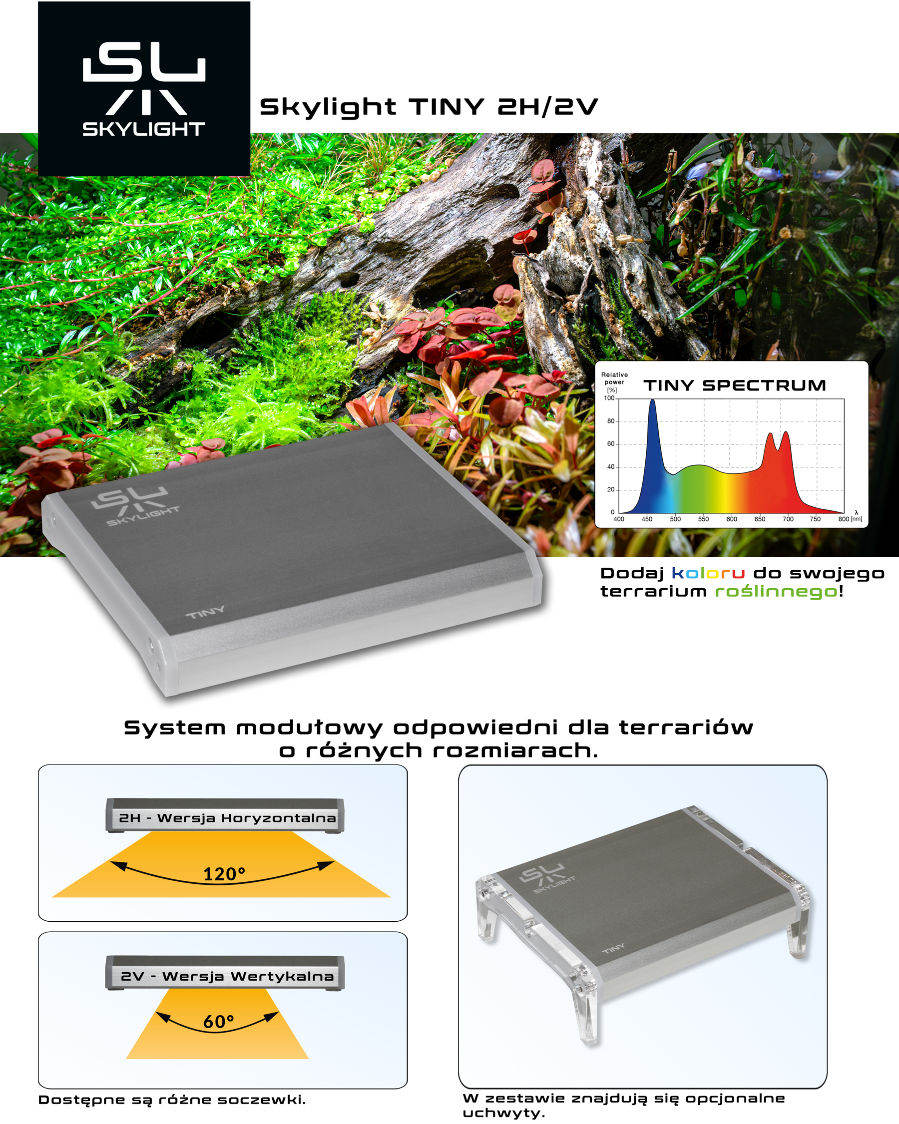 Skylight Tiny 2H to wersja przeznaczona do niższych, szerszych terrariów. Kąt świecenia to aż 120 stopni, dzięki czemu lampa oświetla sporą powierzchnię w terrarium pomimo swoich kompaktowych rozmiarów.