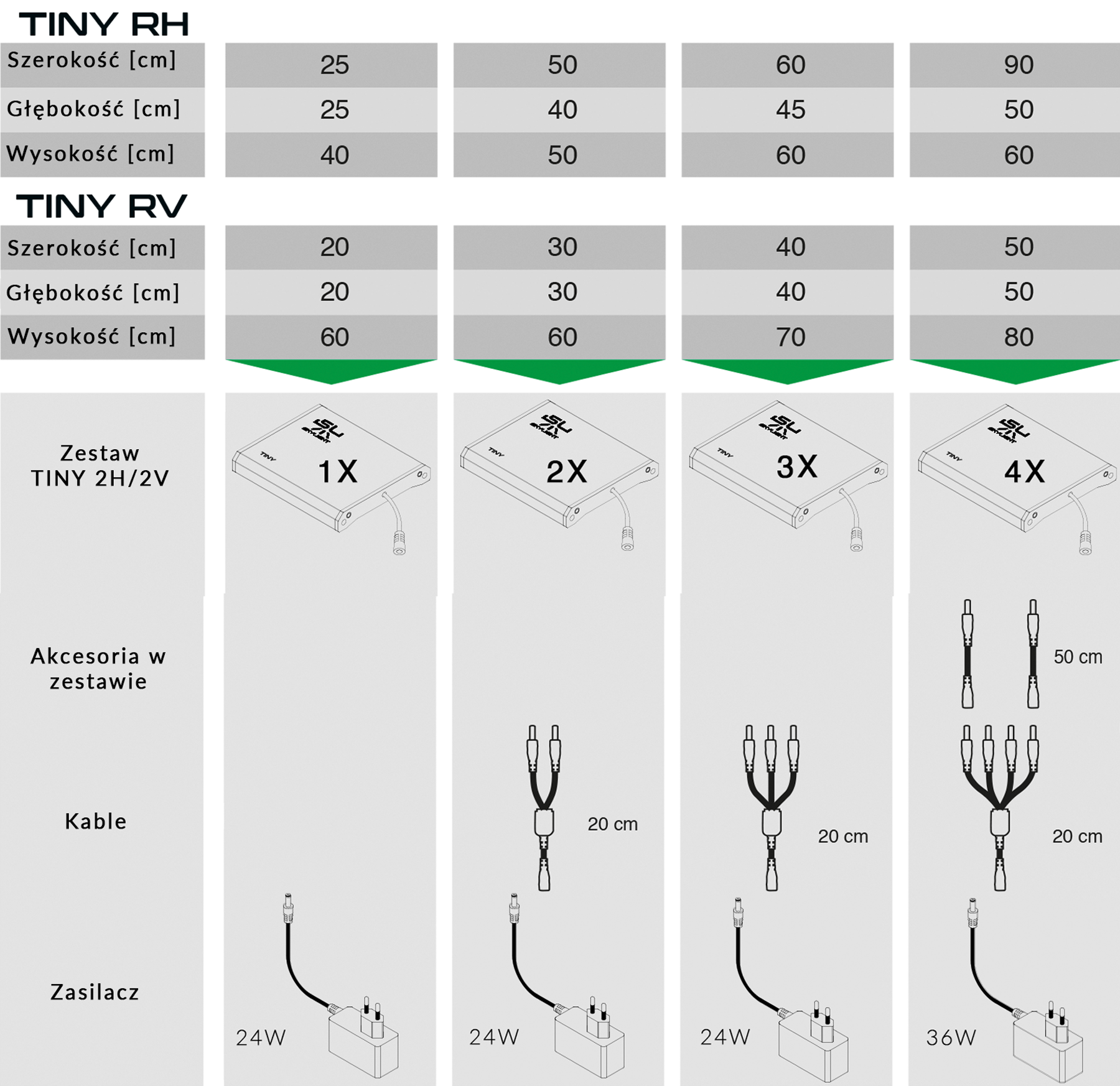 1 lampa + zasilacz ,2 lampy + zasilacz ,3 lampy + zasilacz ,4 lampy + zasilacz |