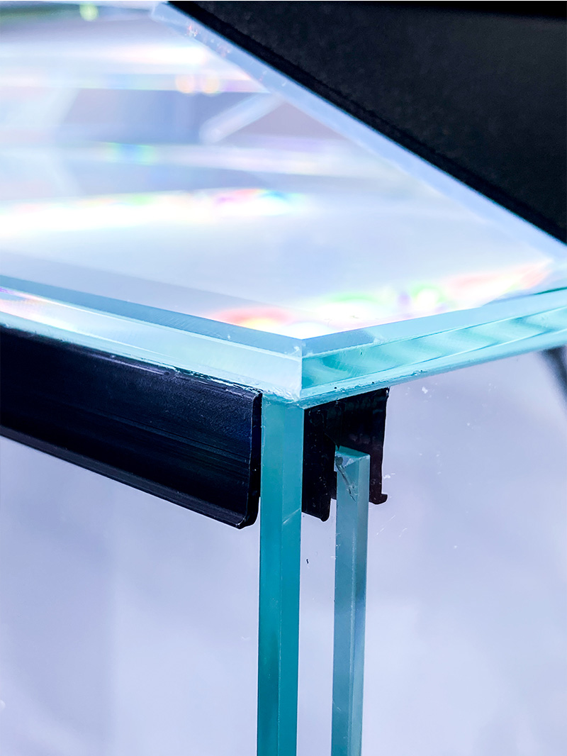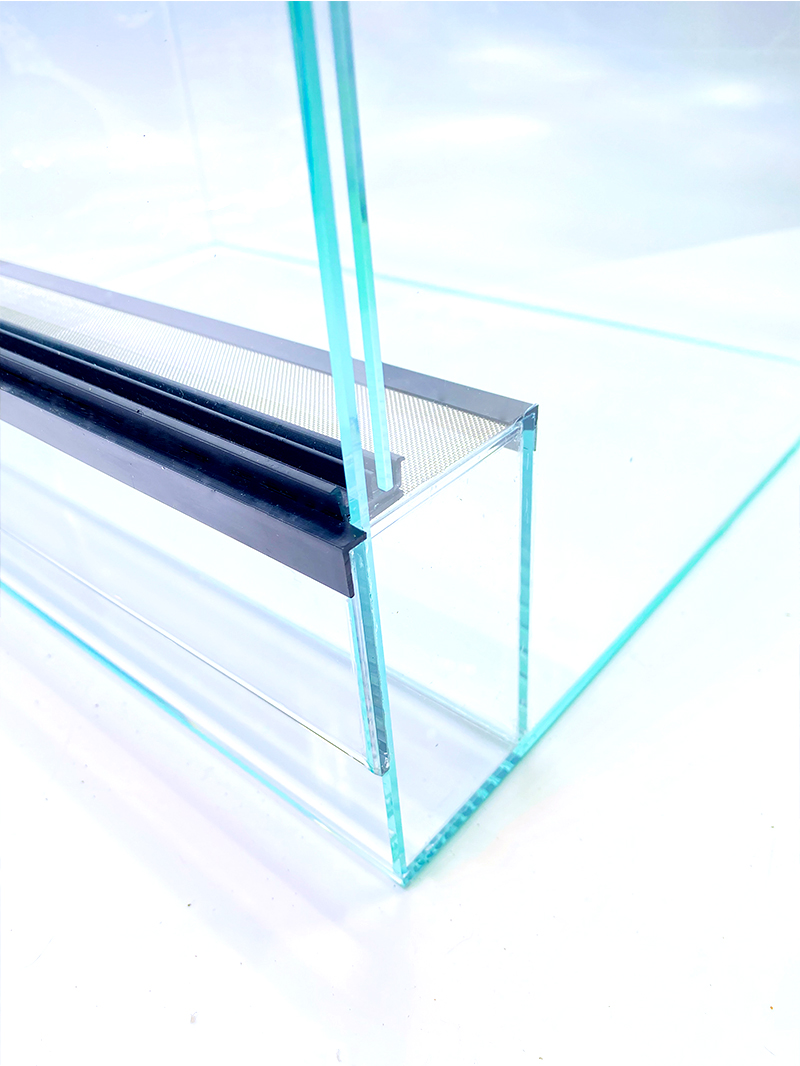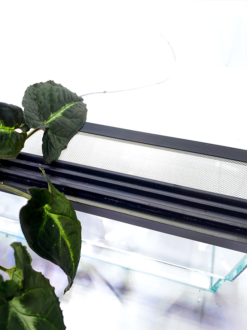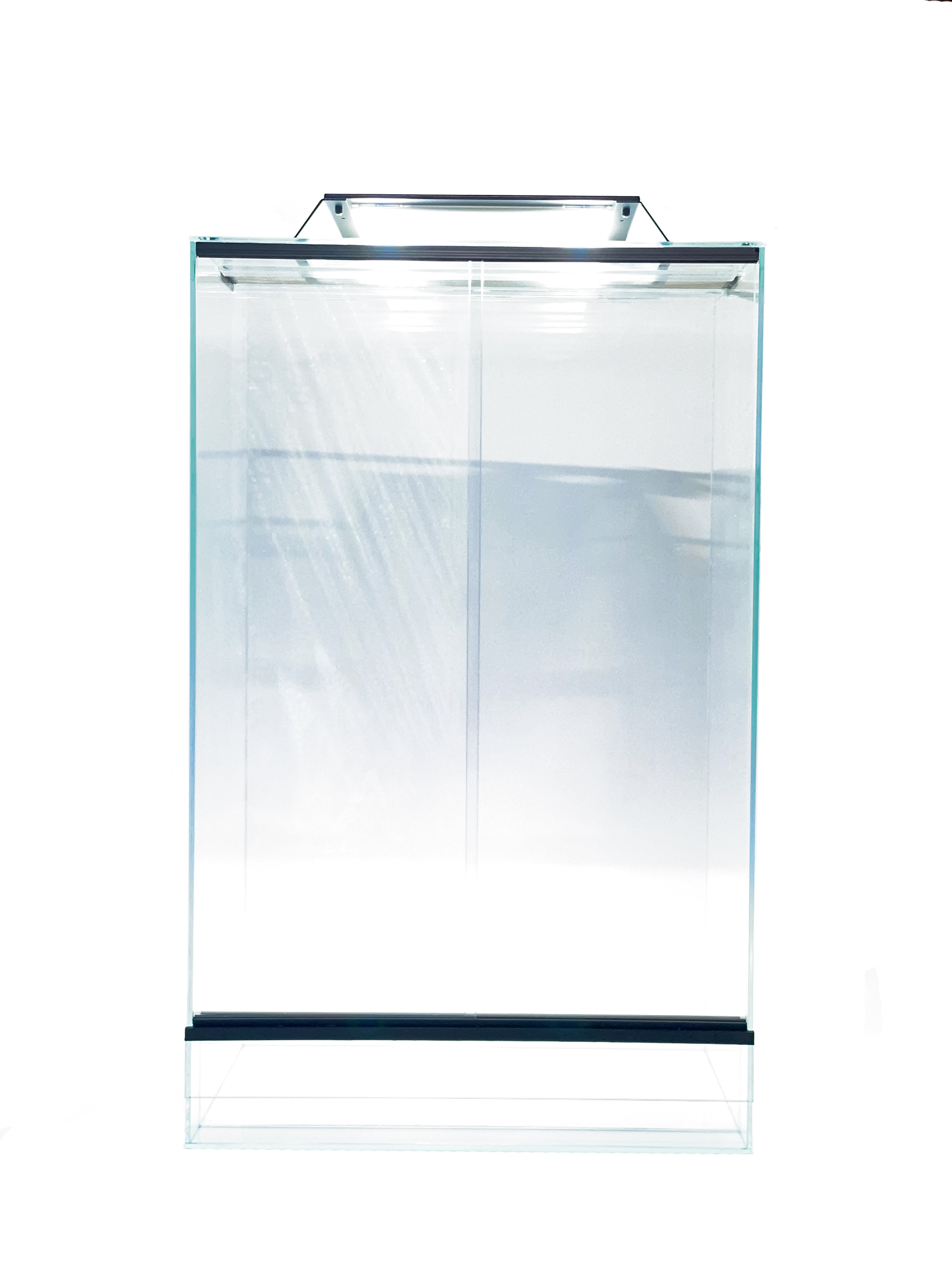 Terrarium dla drzewołazów, gekonów oraz innych małych i średnich zwierząt egzotycznych. Wykonane z najwyższej jakości polerowanego szkła Opti-White, klejone bezpiecznym dla zwierząt oraz roślin silikonem. Szlif trapezowy na krawędziach szkła nadaje całości eleganckiego wyglądu. Wentylacja umiejscowiona w górnej oraz dolnej części zbiornika, wykonana z bardzo drobnej siatki odpornej na działanie wody, zapewnia naturalny przepływ świeżego powietrza. Ostre krawędzie siatki zabezpieczone są przy pomocy elementów z tworzywa PCV oraz pasków szlifowanego szkła, aby terrarium było w pełni bezpieczne dla użytkownika oraz hodowanych w nim zwierząt. Pomiędzy dwoma frontowymi elementami umieszono bezbarwną uszczelkę z tworzywa. Minimalizuje ona ryzyko wychodzenia nawet bardzo drobnych owadów karmowych jak muszki D. melanogaster, nie ograniczając przy tym widoczności. Głębokość dna została dobrana w taki sposób, aby można było zastosować grubą warstwę podłoża, które stabilizuje warunki w zbiorniku. Każde terrarium do hodowli drzewołazów dostępne w OrangeFrog.storeposiada bezbarwne spoiny, które podnoszą estetykę wykonania oraz nie ograniczają widoczności.
