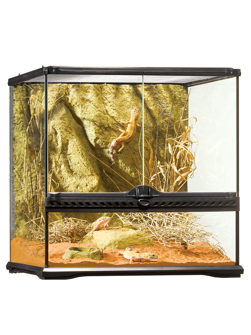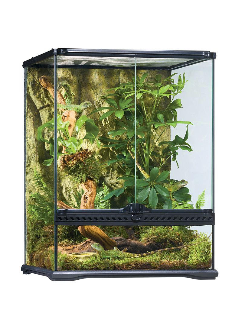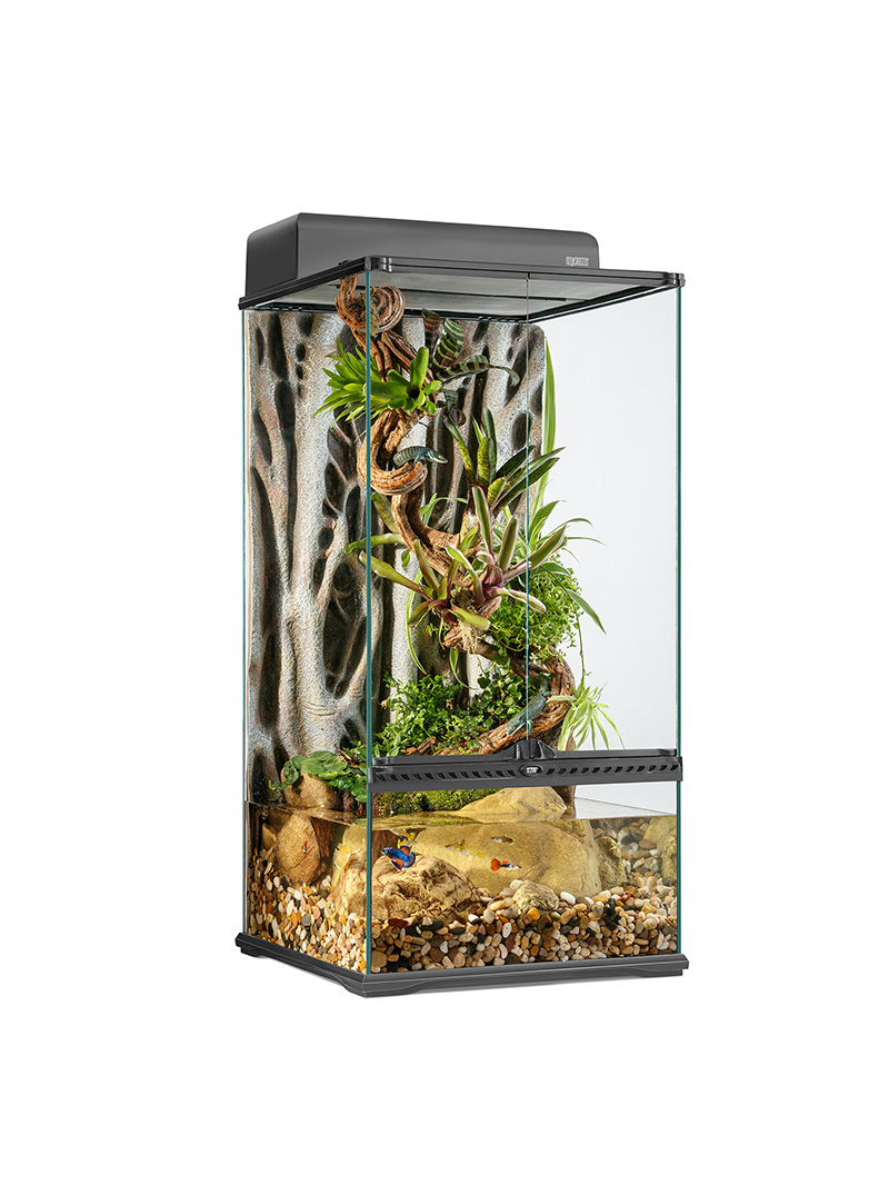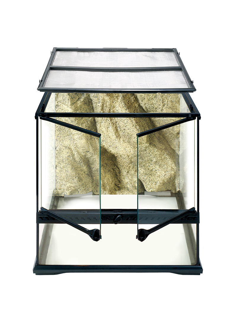 Terrarium dla gadów, płazów, owadów oraz innych małych zwierząt egzotycznych. Bardzo wygodne w obsłudze, trwałe i estetycznie wykonane. Posiada podwójne, niezależnie otwierane drzwi na zawiasach z zamkiem i demontowaną pokrywę z siatki. Kompatybilne z wieloma dedykowanymi akcesoriami.