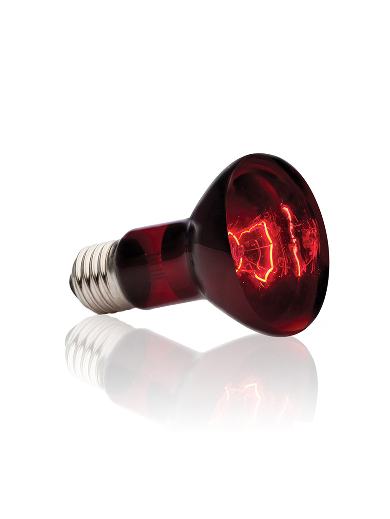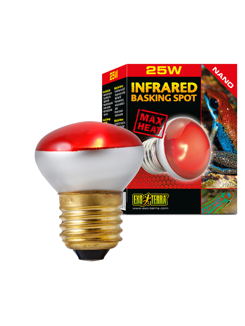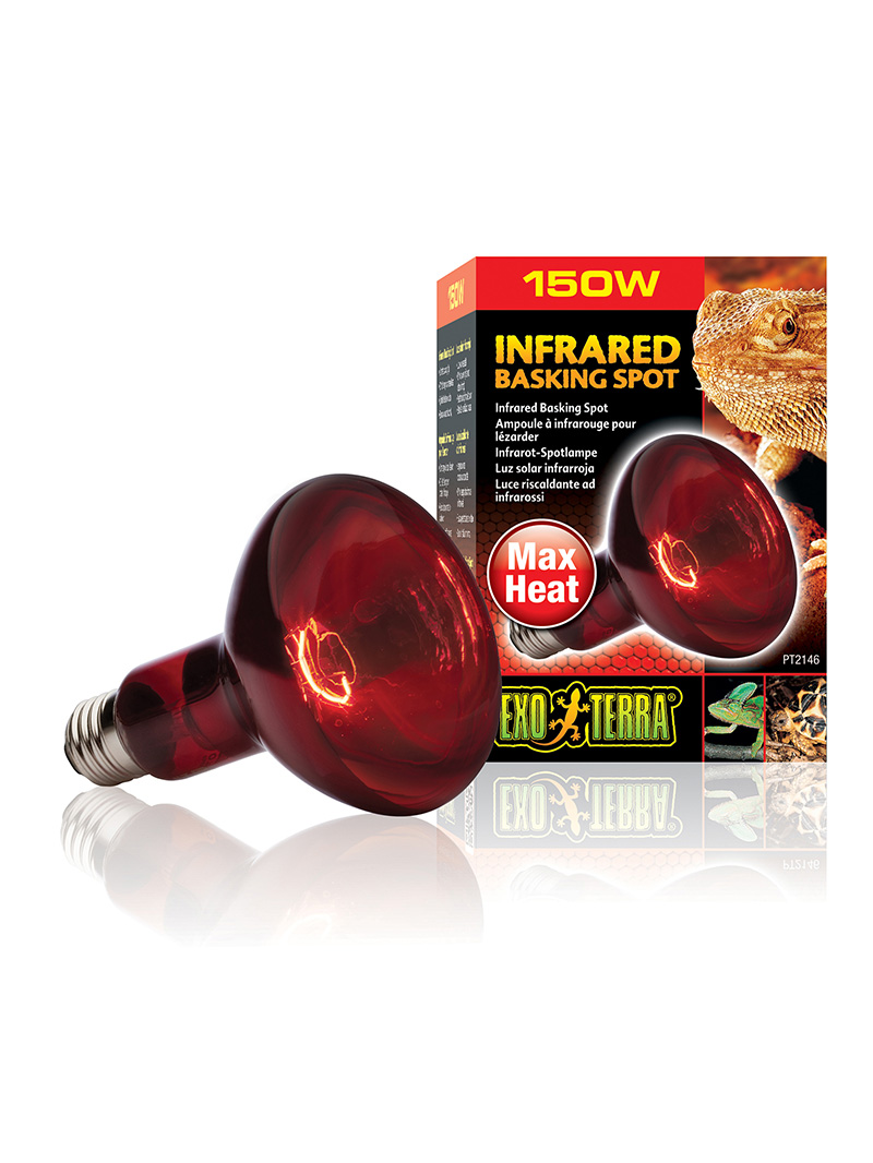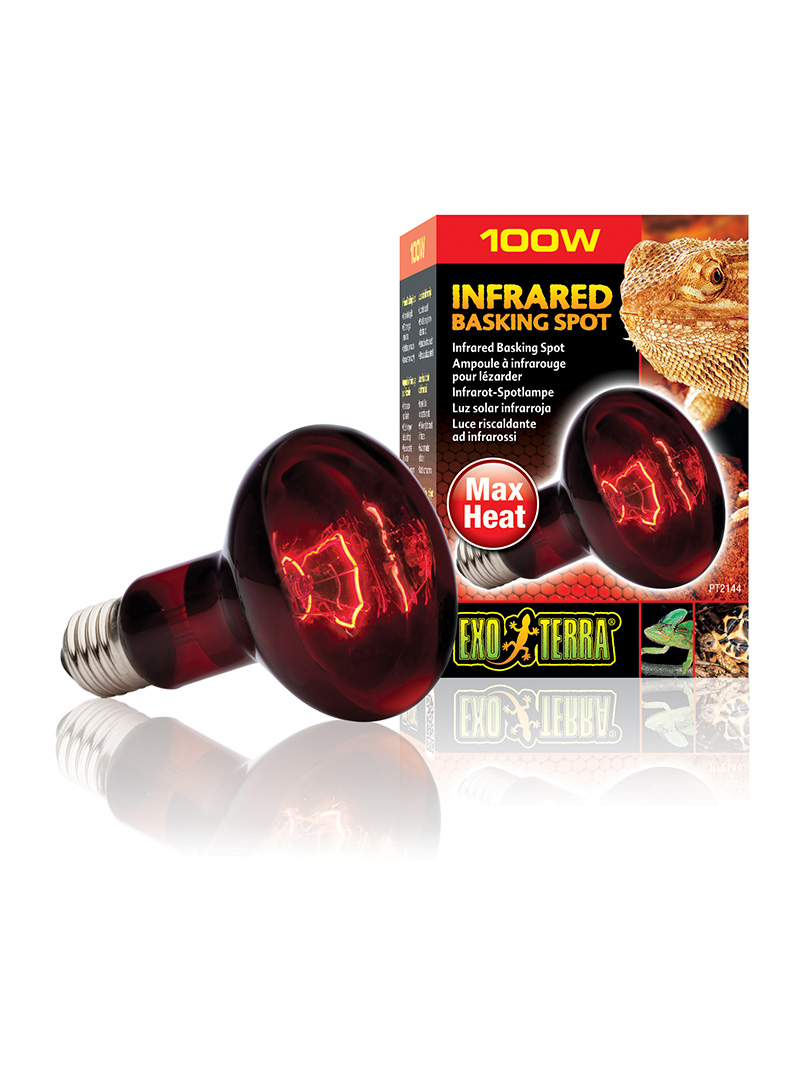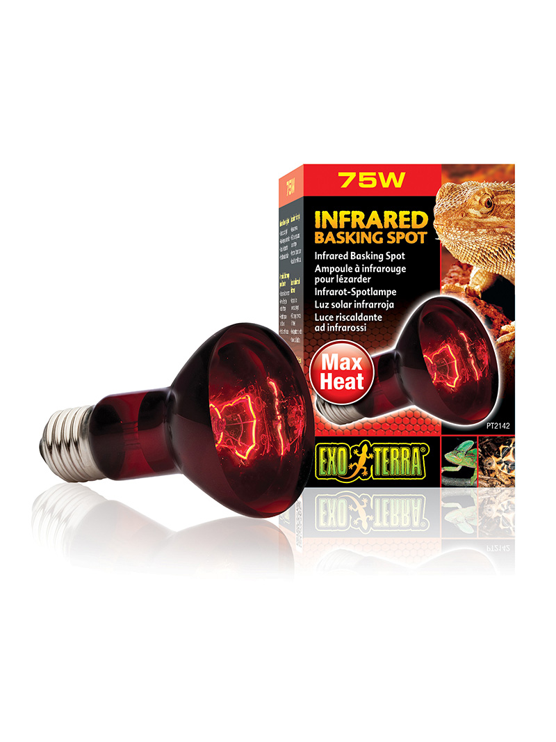 Exo Terra Infrared Basking Spot is a heating lamp that emits infrared heat waves. The spot lamp has a special build-in reflector to direct the heat in any direction required. The reddish light will not disrupt normal activity during night or day, which makes it an excellent 24 hour heat source.