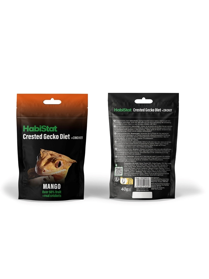 HabiStat Crested Gecko Diet – Mango / Cricket contains over 50% fruit and 9 key protein sources. It has been manufactured without the use of artificial colours, flavours, preservatives or fillers.