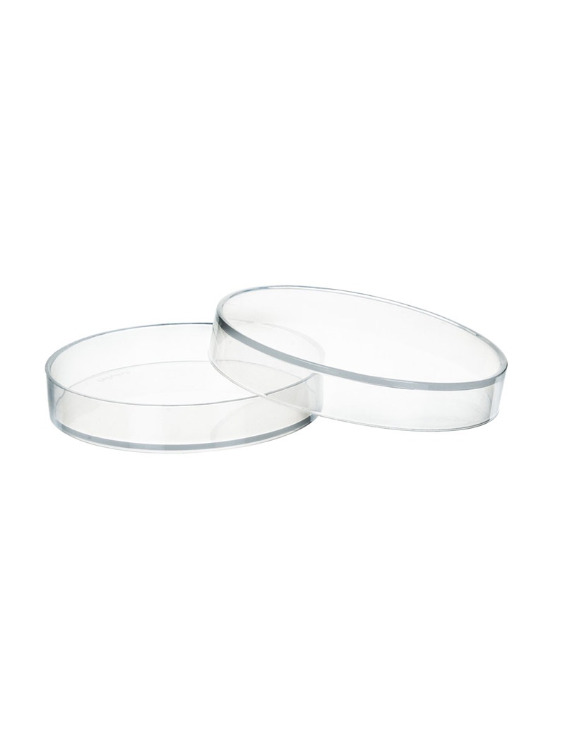 Petri dish made of plastic with diameter of 55 mm and height of 14 mm.