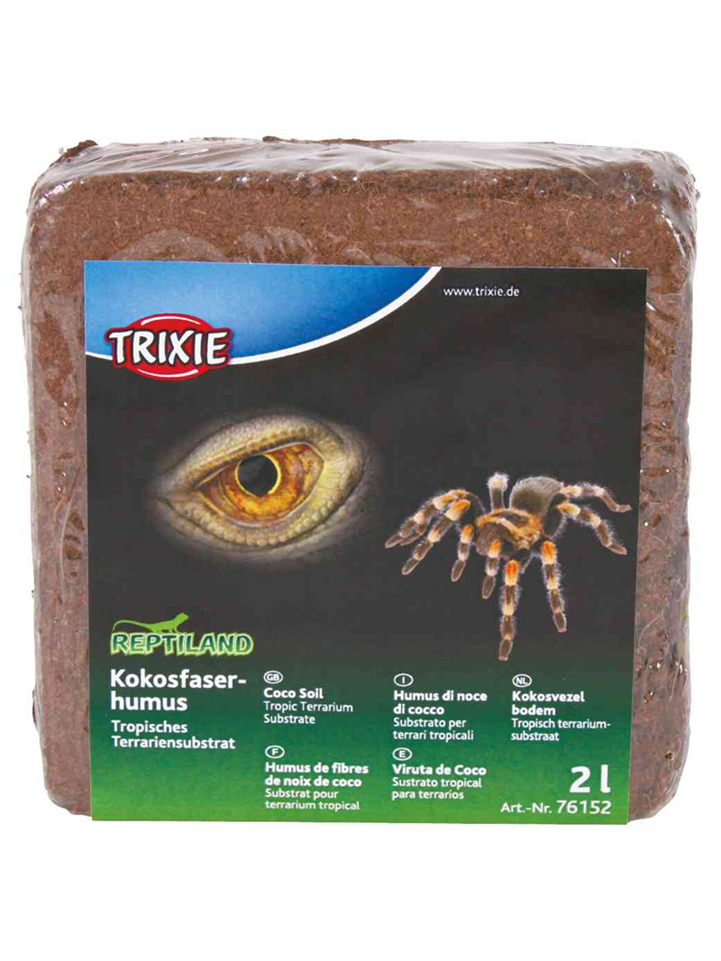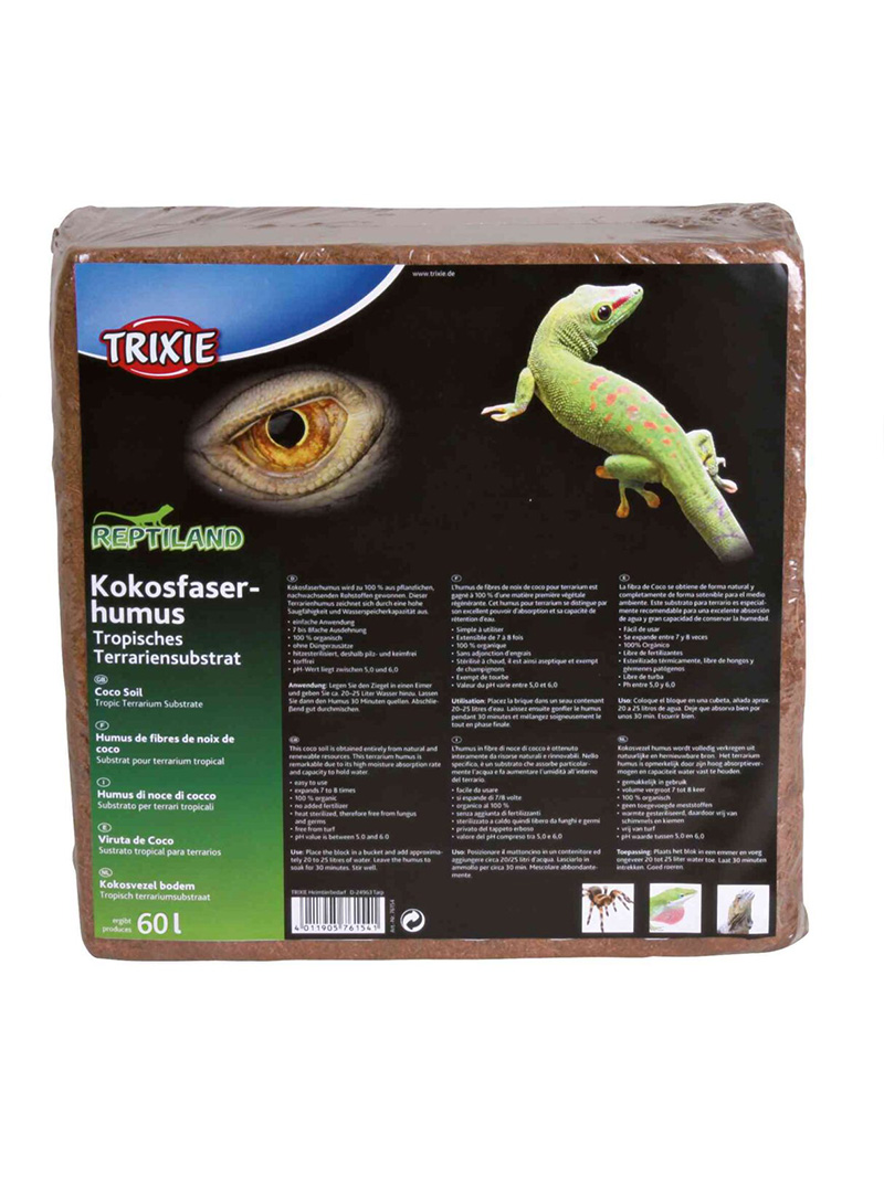 Trixie – coconut fibre – a natural terrarium substrate in the form of pressed briquette, which increases in volume by 7-8 times when soaked. It has a pH value between 5.0 and 6.0, is heat sterilised, free of fungi and germs and contains no fertiliser.