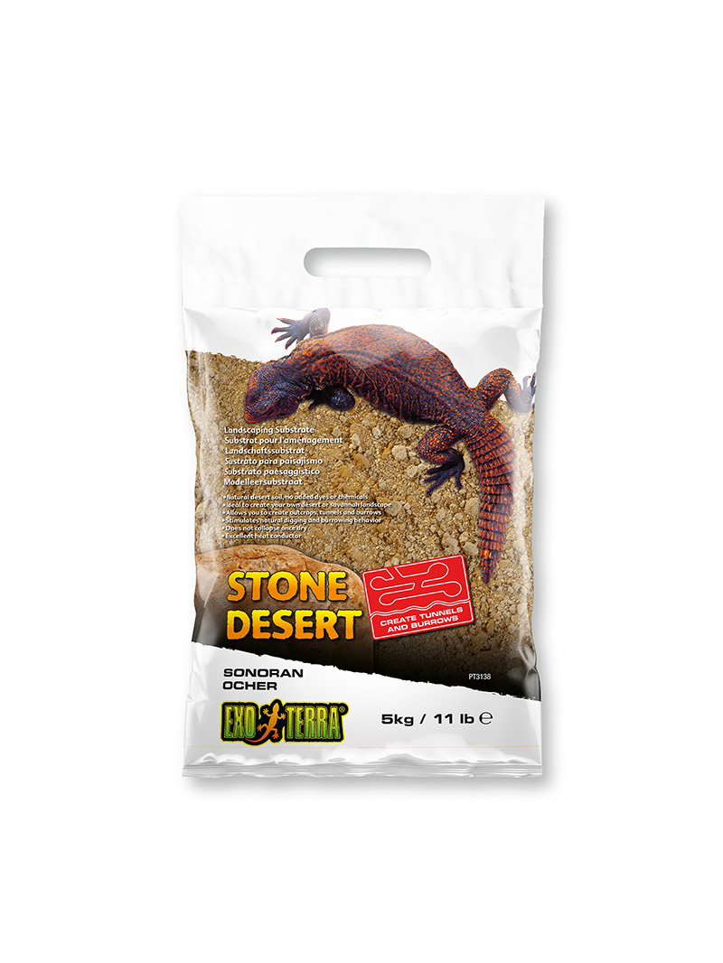 Exo Terra Stone Desert SONORAN OCHER je vynikajúcou imitáciou prírodnej pôdy charakteristickej pre suché púšte, polopúšte a savany, ktoré sa nachádzajú v rôznych častiach sveta. Rovnako ako v prírode obsahuje táto zmes nielen piesok, ale aj hlinu a jemný štrk rôznej zrnitosti a odtieňov. Vďaka rôznorodým textúram môžete obnoviť prirodzené prostredie presnejšie ako kedykoľvek predtým. Textúra a zloženie substrátu Stone Desert vám umožní vytvárať rôzne útvary a tiež vám poskytne možnosť vykopať hlboké, chladné nory, ktoré poskytujú zvieratám úkryt. Mnohé plazy absorbujú vlhkosť z prostredia prostredníctvom kože, preto je veľmi dôležité poskytnúť im možnosť pobytu vo vlhkom, chladnejšom prostredí. Naopak, na povrchu sa vytvárajú teplejšie miesta, najmä pod tepelnými lampami alebo sálavými ohrievačmi, ktoré sú ideálne na vyhrievanie.